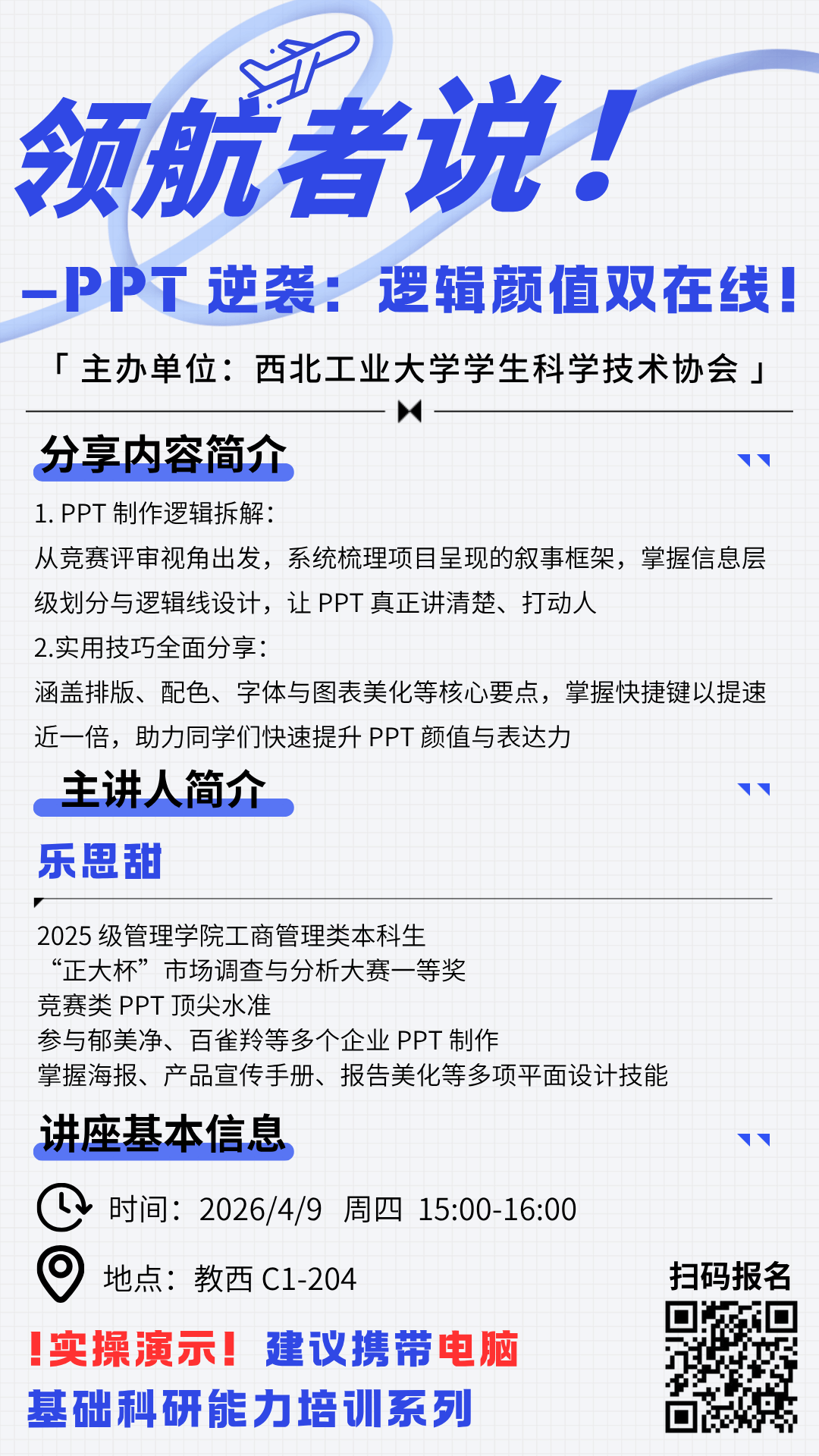 还在为竞赛 PPT 逻辑混乱、颜值拉胯而发愁?想做出评审一眼惊艳、逻辑清晰的高分 PPT,为答辩与项目展示赋能?科协专为同学们量身打造这场干货分享,带你从评审视角拆解 PPT 底层逻辑,解锁颜值与效率双提升的实用技巧!