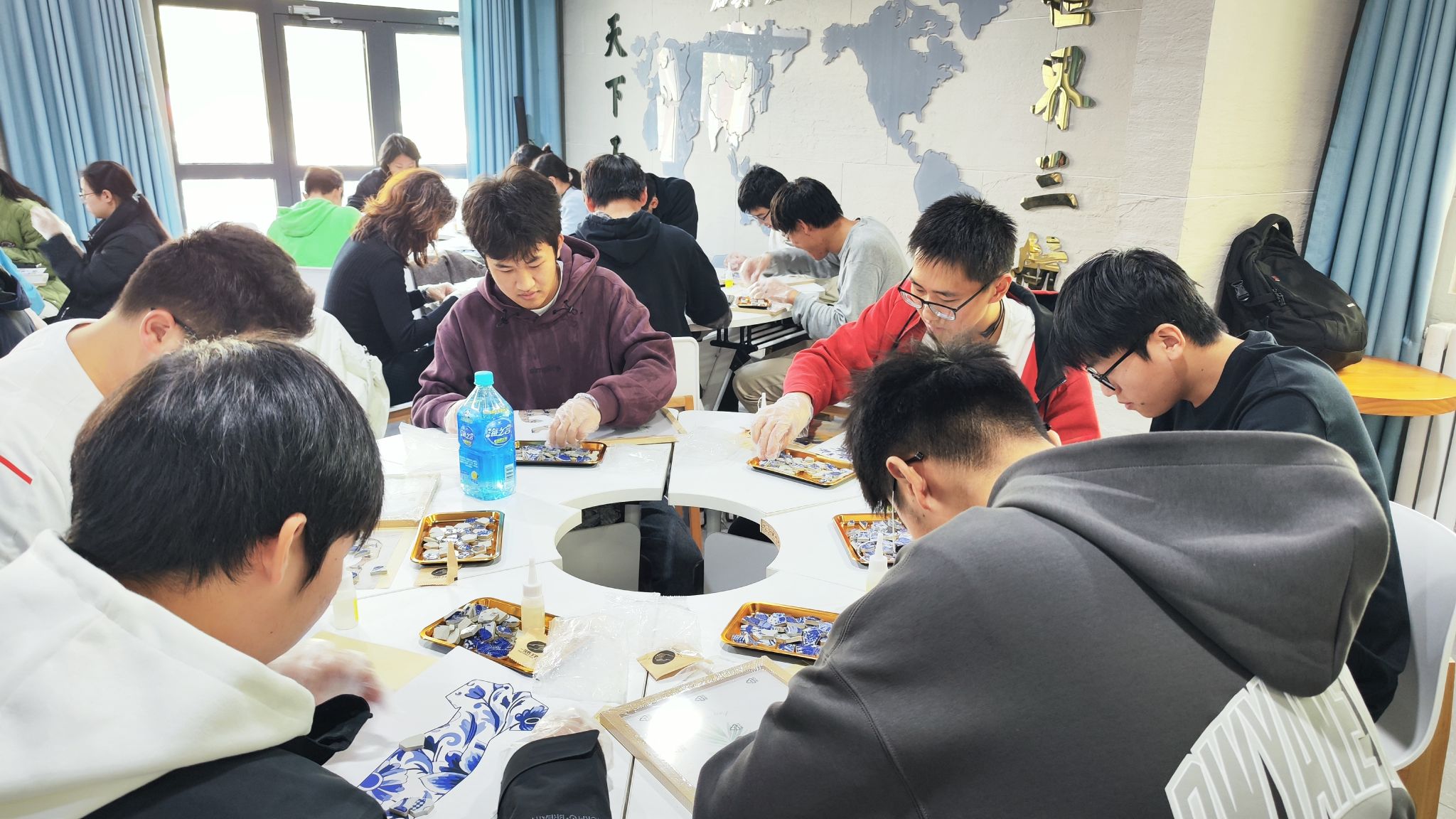 通过讲解青花瓷历史、工艺美学特征、传统纹样解析等环节,铸剑班同学在非遗讲师的带领下走进了青花瓷非遗工艺的世界。青花瓷的蓝白相生、纹样的图底共生,恰如中华民族多元一体的文化基因,引导同学们从中华优秀传统文化中感悟“各美其美,美美与共”的深刻内涵。同学们亲自感受青花瓷的文化魅力,切身体验制作瓷器画,用碎瓷片拼出非遗瓷器画。在体验的过程中分享自己的创作灵感与体验感悟,活动气氛热烈融洽。