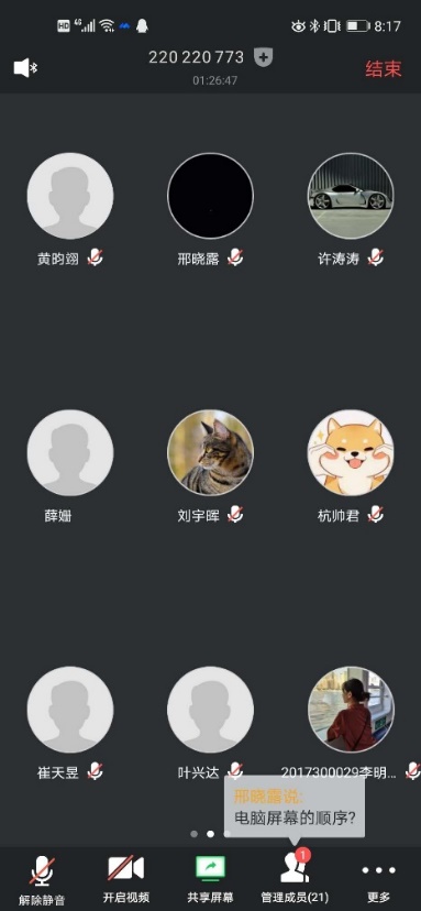 我们在疫情防控的这个特殊的时期,利用网络开展了一次线上班会,班长林红旭首先询问了大家寒假以来的学习生活情况,并组织学习了学校关于疫情期间每名同学应该遵守的政策规定,然后,章飞宇同学给大家分享了自己在疫情防控期间所参与的志愿服务与感想。之后,学校研究生会主席魏至男学长、计算机学院研究生会主席孙辛茹学姐,共同介绍了她们充实而丰富的研究生生活,并积极分享了他们的科研体会及学术成果,极大地调动了同学们的学习动力。2016级大班班长姚卓尔学长为同学们介绍了2016级同学升学深造的情况,给同学们带来了极大帮助。最后,蒋雯老师结合大家实际提出了自己的想法和建议,为同学们下步的选择提供了有益的参考,同学们纷纷表示将会珍惜在校时光,在扎实学好专业知识的同时,努力参与竞赛、科研活动,不断丰富自己的经历,提升自己的能力水平。