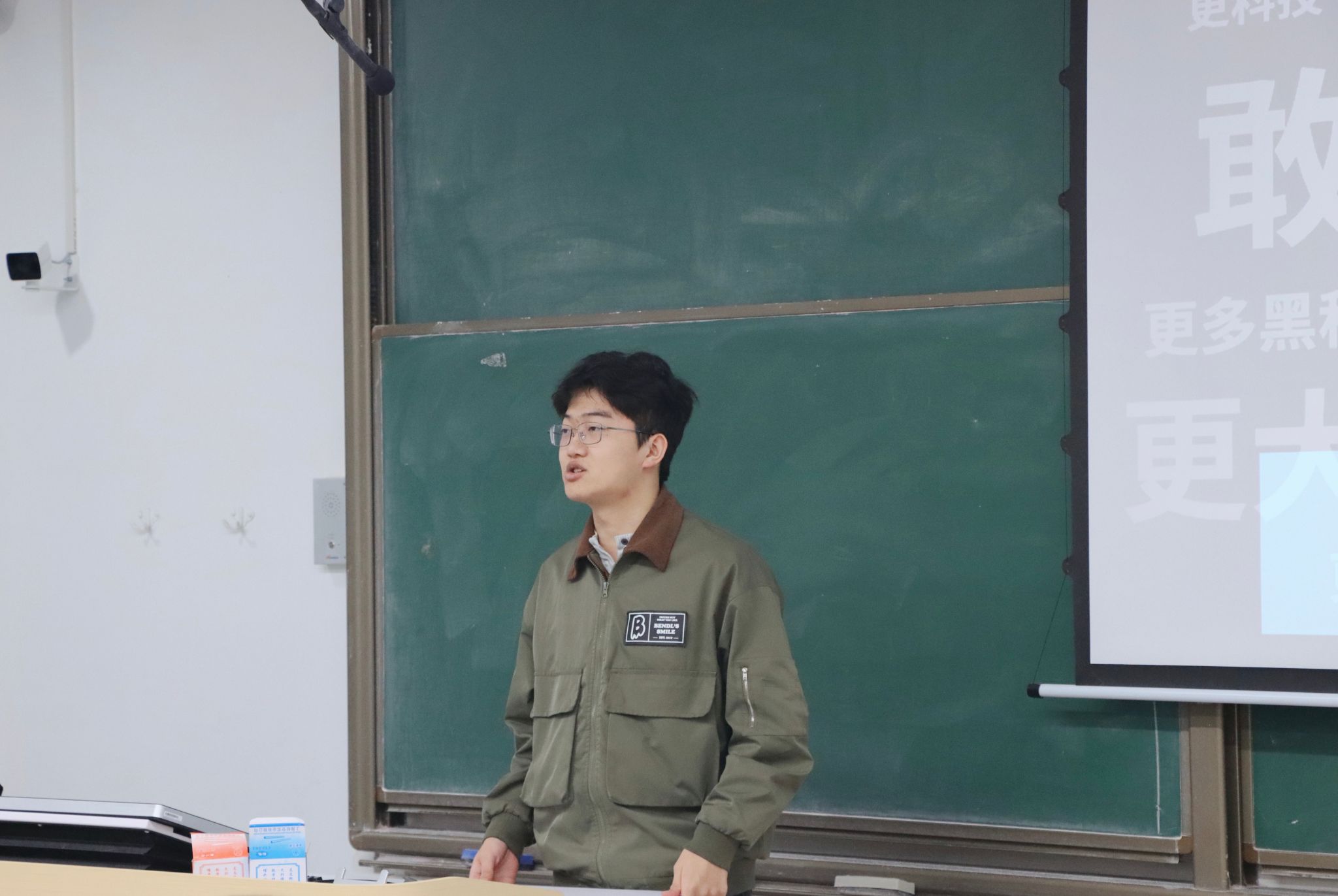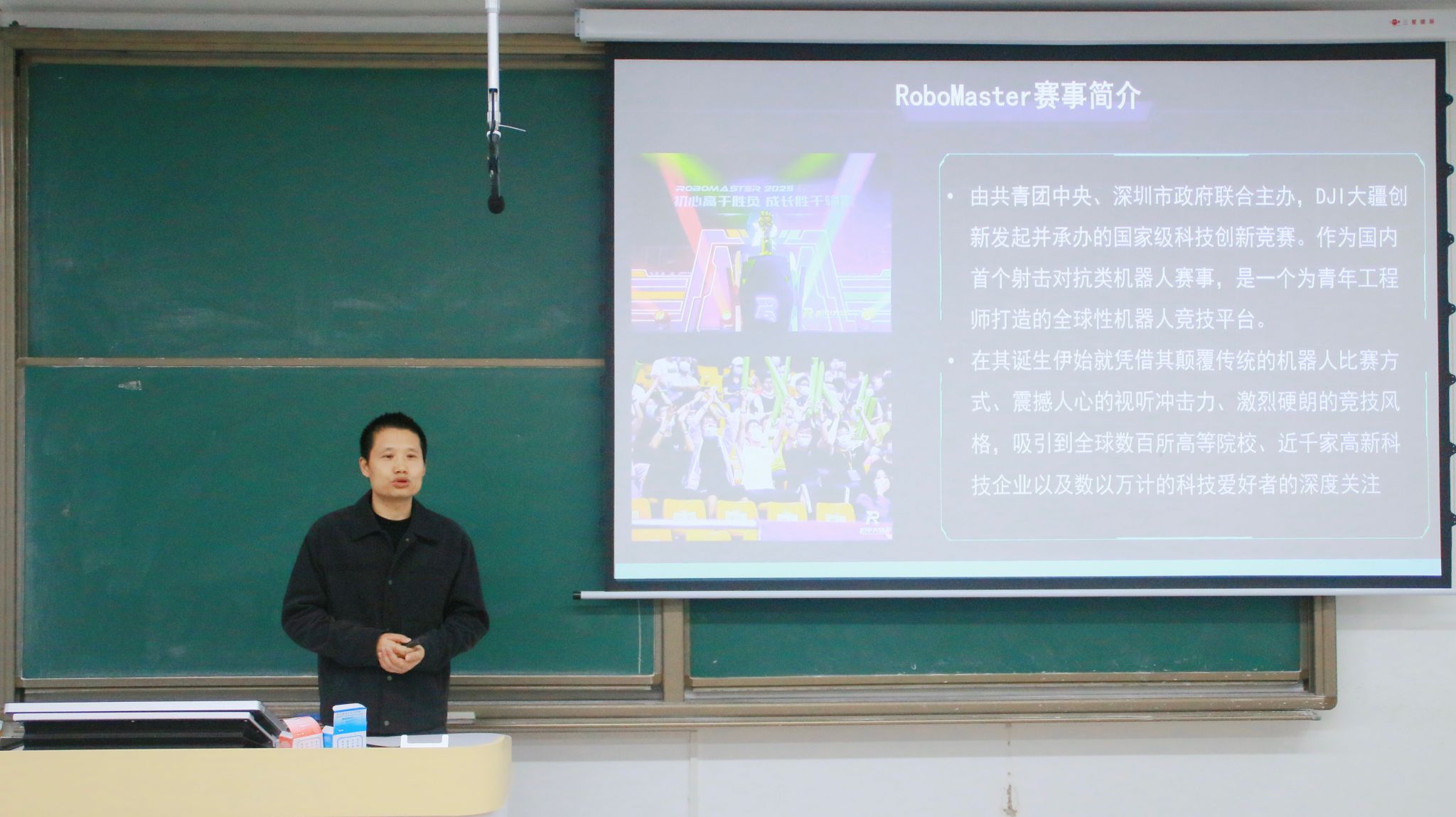 蔡力首先介绍了吕冰老师在教学及创新创业方面的成果。随后,吕冰老师围绕基地硬件条件、师资配置与创新成果,简要介绍了基地的建设情况,着重讲解了RoboMaster机甲大师赛事的背景与规则。他结合西北工业大学WMJ战队的实际赛况,生动讲述了队员们在备赛期间日夜奋战、克服困难、持续优化机器人性能的拼搏过程。从适应性训练到小组赛、淘汰赛,队员们始终全心投入,在每一阶段都与机器人紧密配合,在实战中锤炼能力,在与队友的协作中共同成长。