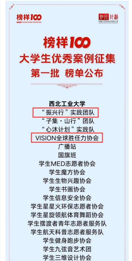 近日,2025年“榜样100”全国优秀大学生社团/团队榜单正式发布,教育实验学院/未来技术学院/学科交叉中心“振兴行”实践团队、VISION全球胜任力协会以优异的成绩脱颖而出,高位入选。