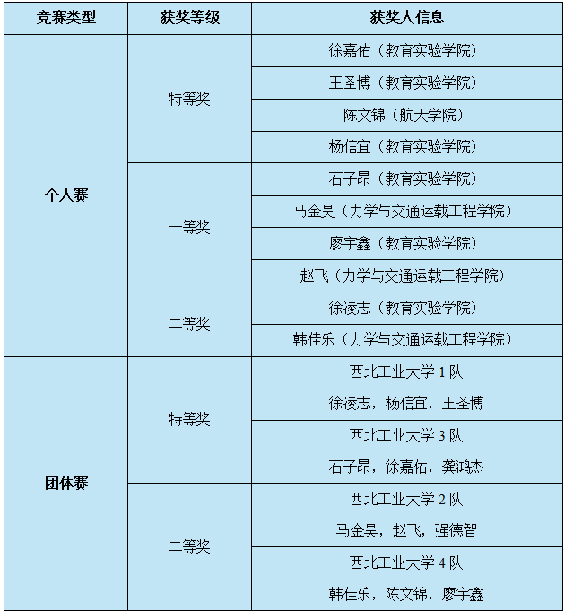 团队赛中,我院徐凌志、杨信宜、王圣博三位同学组成的西北工业大学1队,石子昂、徐嘉佑、龚鸿杰(航空学院)三位同学组成的西北工业大学3队,凭借良好的团结协作与临场应变能力均获特等奖;廖宇鑫参与的西北工业大学4队获二等奖。