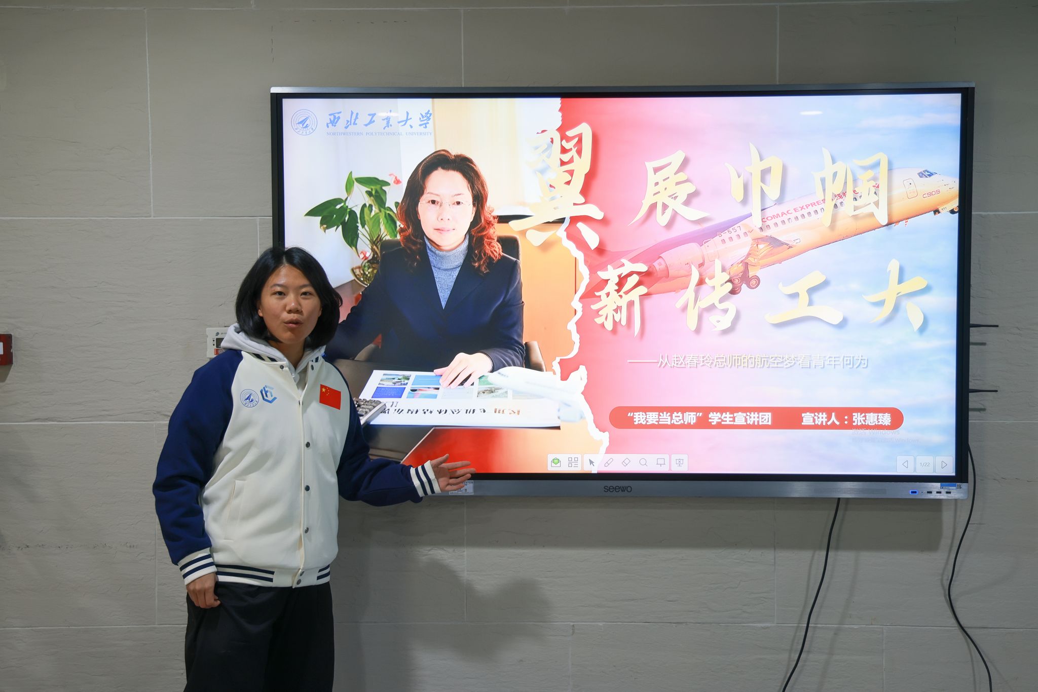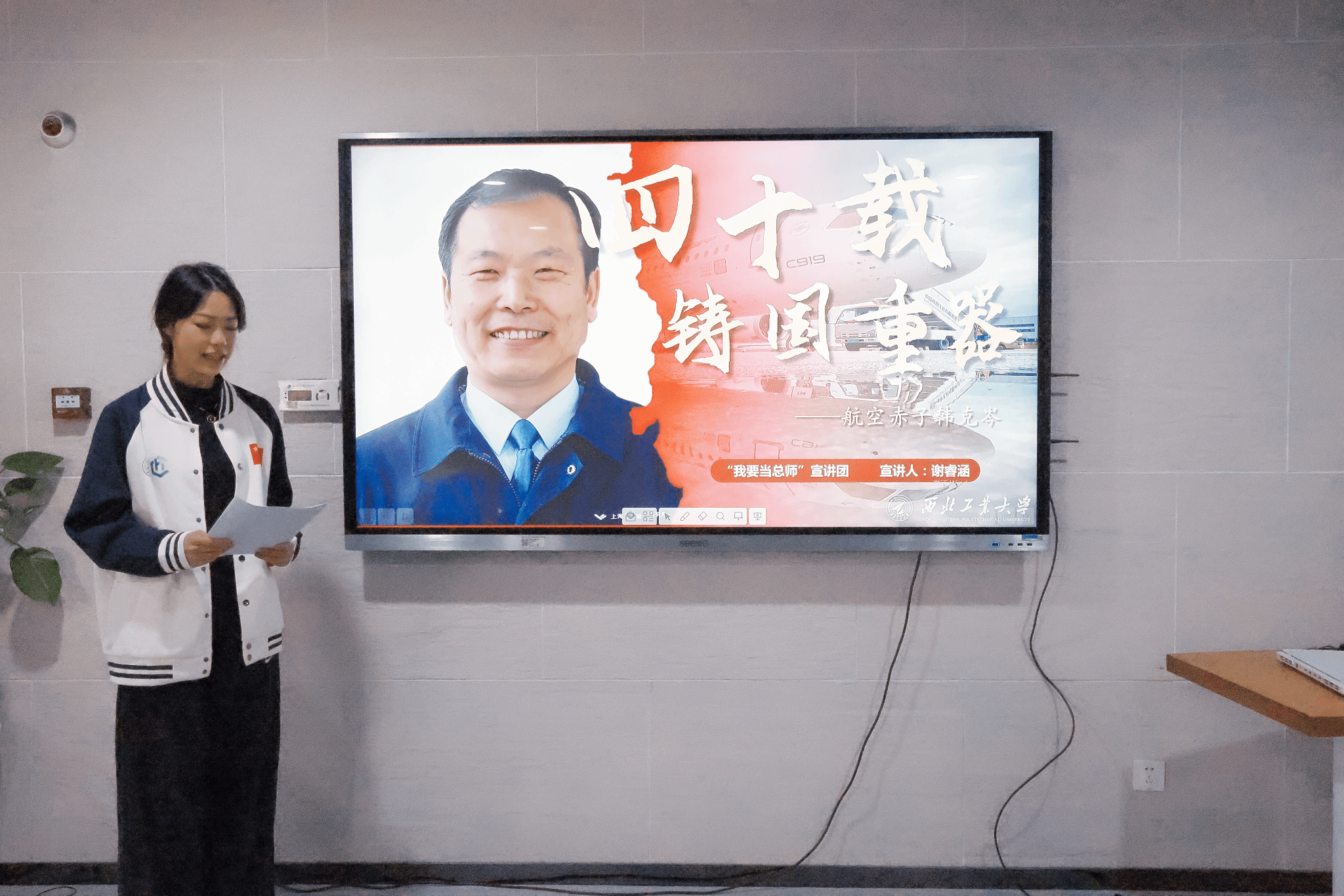 宣讲团成员高悦芸、谢睿涵、张惠臻分别围绕歼-10C、C919、C929总设计师成长故事,细腻勾勒出科研工作者在困境中坚守初心、在难关前无畏攻坚、在技术封锁下自立自强的精神群像,让榜样力量跃然眼前。歼-10C总师扎根西北、矢志空天,推动中国战机跻身世界先进行列;他对设计细节的严谨苛刻,正是科研人精益求精责任意识的生动写照。C919总师从军用领域跨界民用航空,始终以沉着冷静的姿态带领团队直面危机、破解难题,彰显了科研带头人临危不乱的硬核担当。C929总师携团队与中国大飞机事业同向而行,用坚持不懈的工匠精神、矢志蓝天的坚定信念,书写着中国航空的蓝天新史诗。