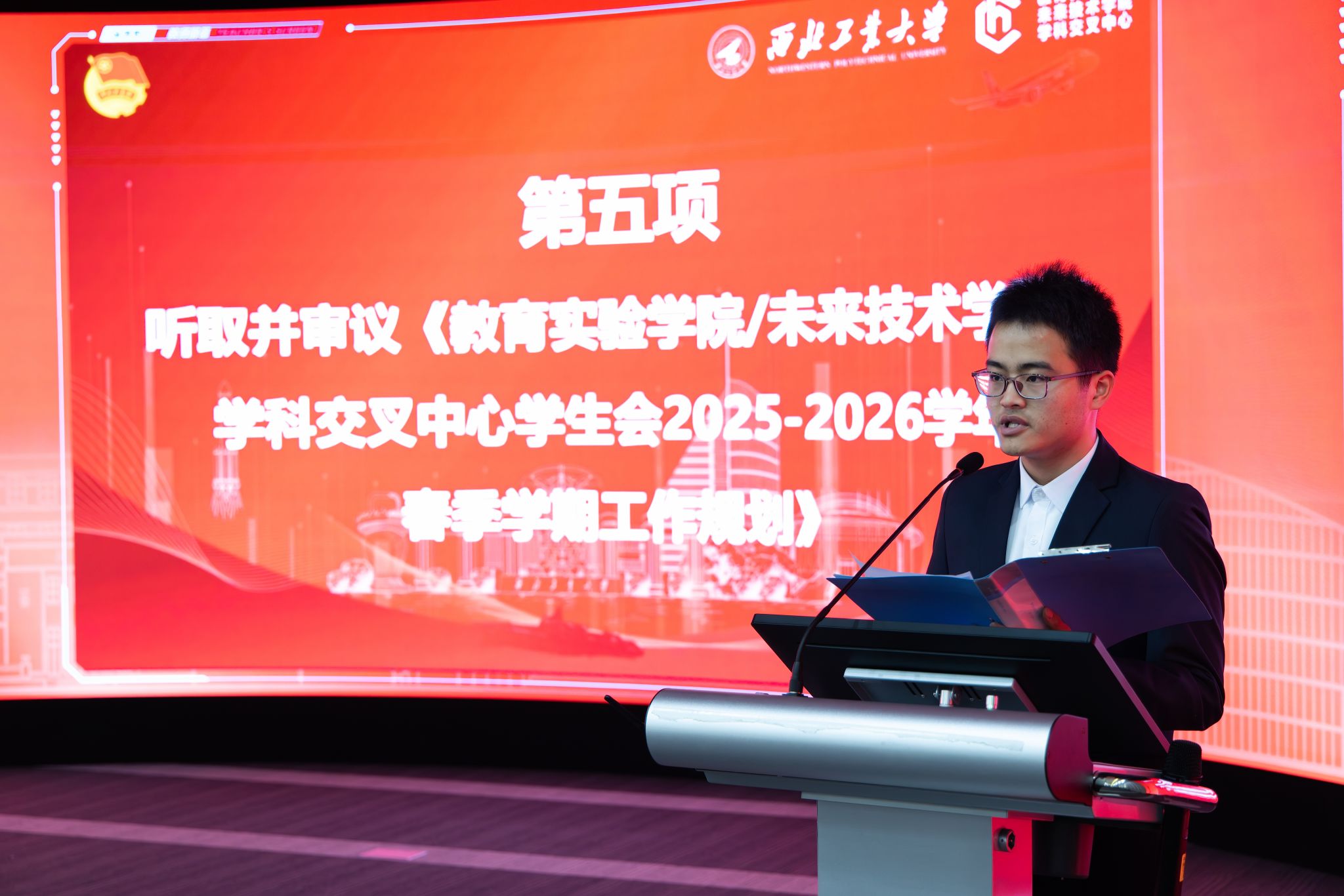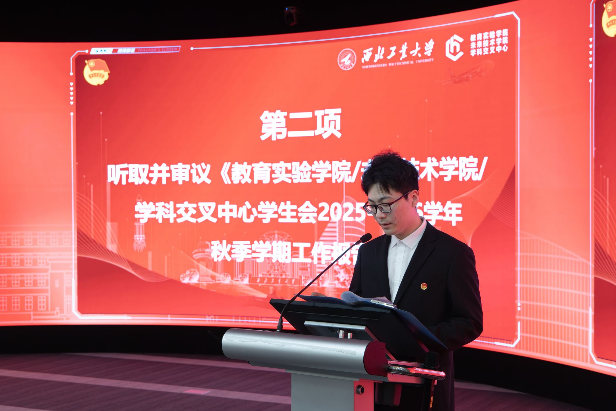 大会在庄严肃穆的氛围中拉开帷幕,全体与会人员起立奏唱国歌。学院学生会主席团成员何嘉强作《教育实验学院 / 未来技术学院 / 学科交叉中心学生会2025-2026学年秋季学期工作报告》,从思想引领、服务学生、组织建设三大维度,回顾了秋季学期学生会工作成效,客观剖析工作存在的问题,为后续改进明晰方向。