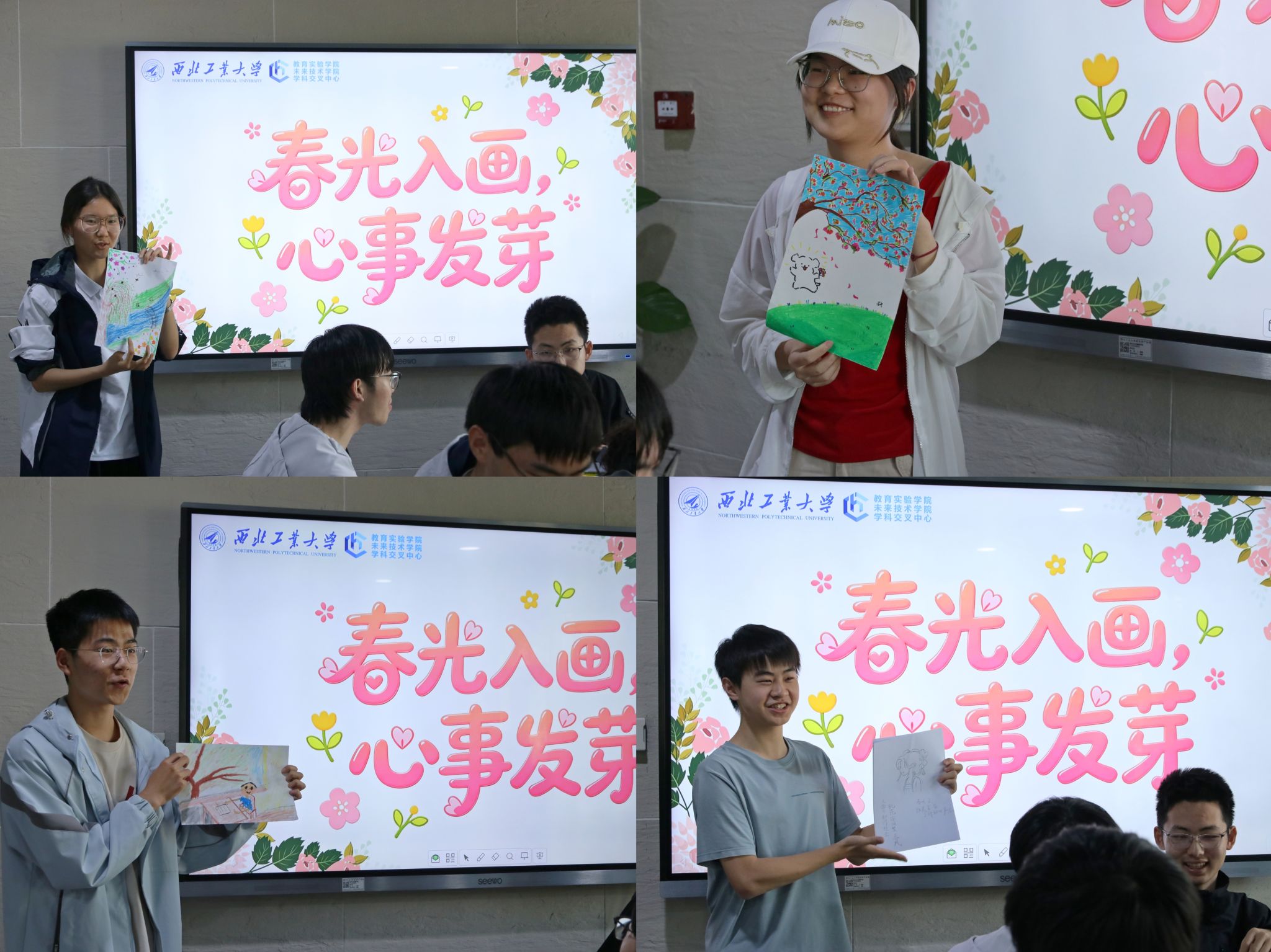 分享交流环节,大家踊跃讲述创作故事、倾诉创作心声,一幅幅画作成为沟通心灵的桥梁,让陌生变得熟悉,让心扉悄然敞开。活动尾声,全体同学手持作品合影留念,定格这一温暖治愈的春日瞬间。